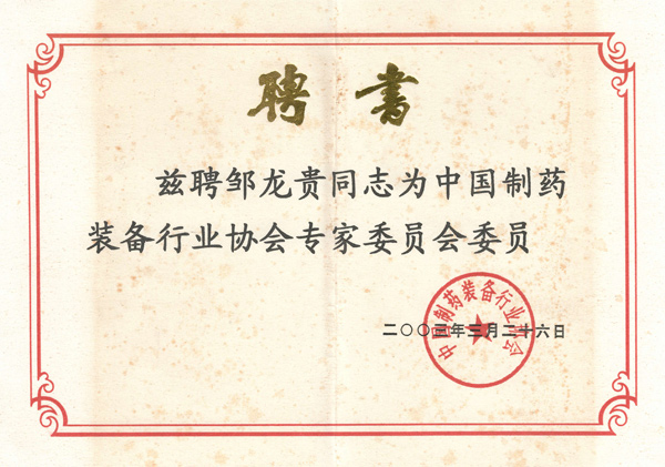 制藥裝備協(xié)會專家委員聘書